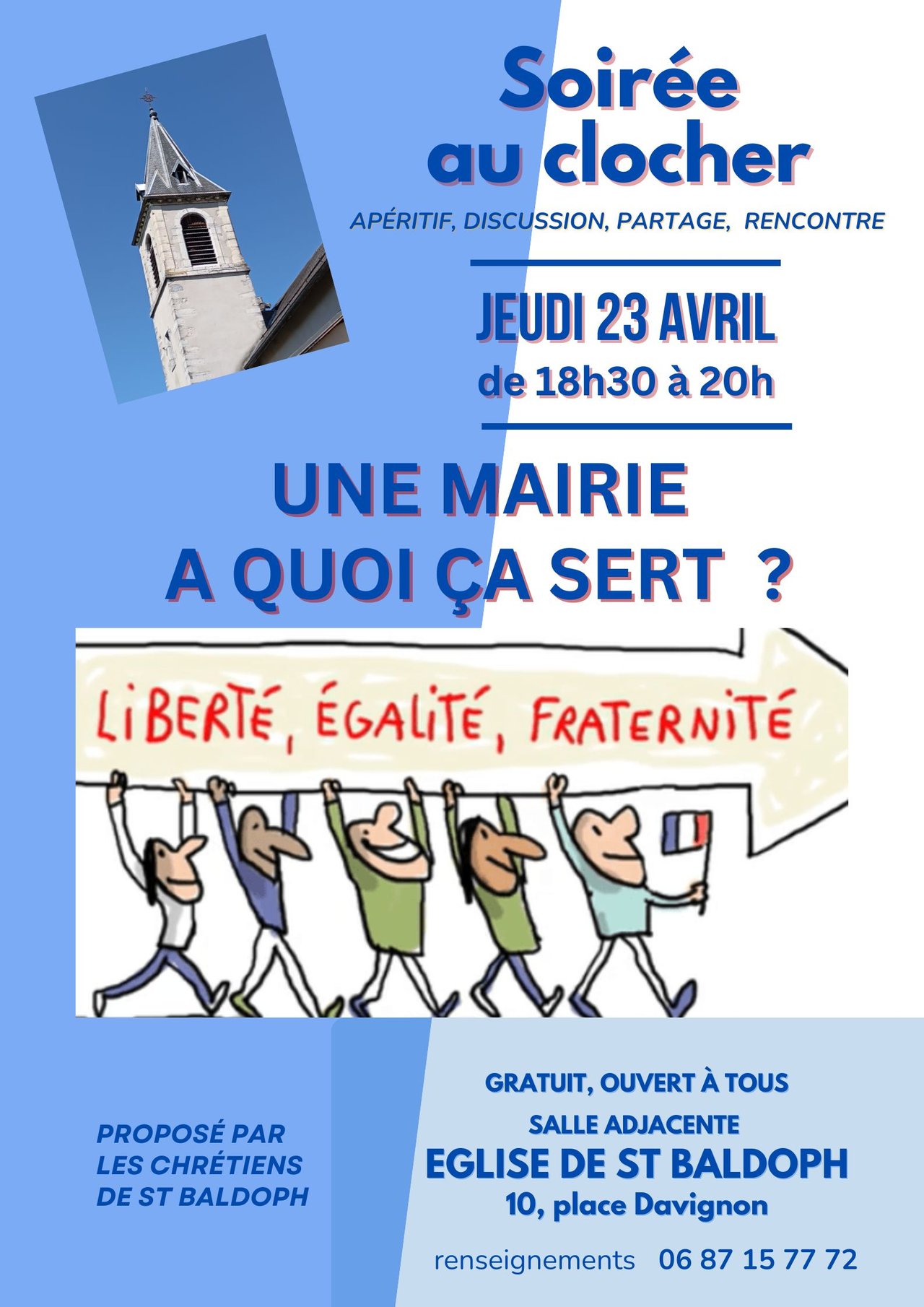 Habitants anciens de St Baldoph, ou nouveaux arrivants dans la commune, vous êtes tous invités et attendus avec joie, pour faire connaissance, se rencontrer, s’informer, partager… Cette « soirée au clocher » est gratuite et ouverte à tous. Proposée par les chrétiens de St Baldoph, elle vise à renforcer les liens entre les habitants de la commune, au-delà des opinions et choix personnels, en échangeant sur des sujets de société qui nous touchent, en favorisant l’écoute et dans le respect des choix de chacun.