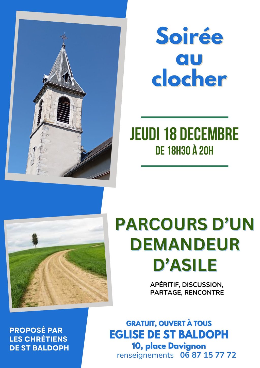 La « Soirée au clocher » du jeudi 18 decembre, à 18h30, nous fera découvrir le parcours de ces demandeurs d'asile à travers un petit film réalisé par les bénévoles, et nous pourrons échanger avec des membres de l'équipe du Secours Catholique.