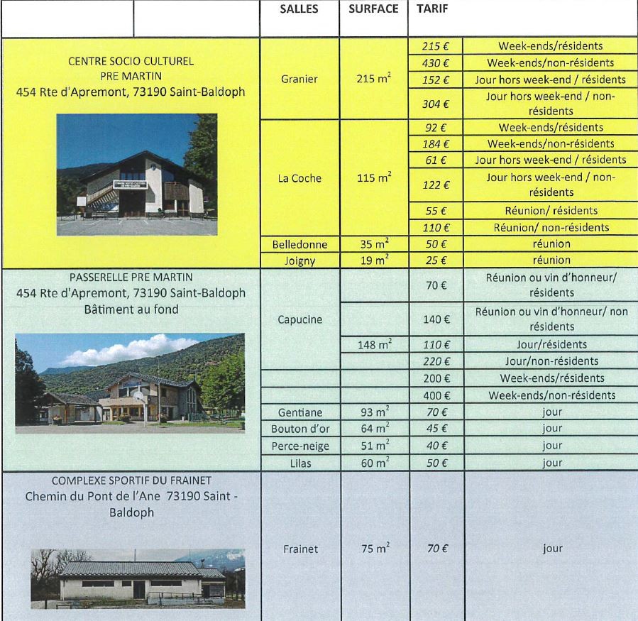 Les tarifs de location sont fonction de la taille de la salle, de la durée d’occupation et du statut du loueur (résident de Saint Baldoph ou non résident).